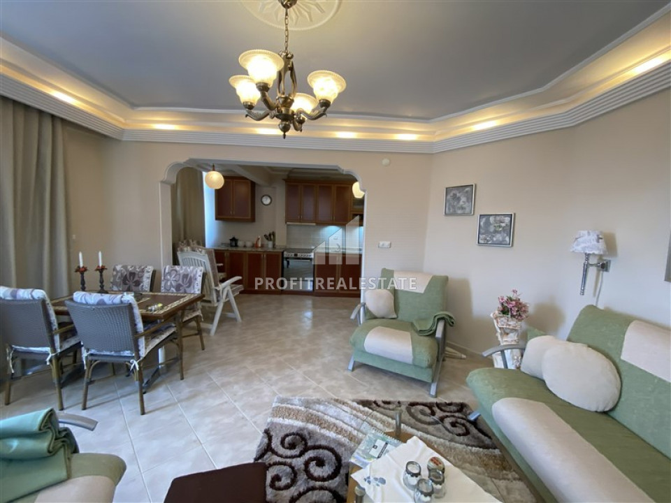 In a well-kept residential residence Mahmutlar, located just 50 meters from the sea and 250 meters from the center of the district, there is a cozy two bedroom apartment for sale with a total area of 110 m2. It includes an entrance hall, two bedrooms, a living room, a kitchen connected to the living room by an arched opening in the wall, a bathroom with a shower and two balconies overlooking the pool and garden. The apartment is very bright and clean, equipped with stylish furniture and household appliances. All of this is included in the declared value.