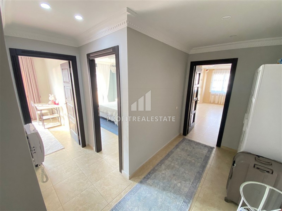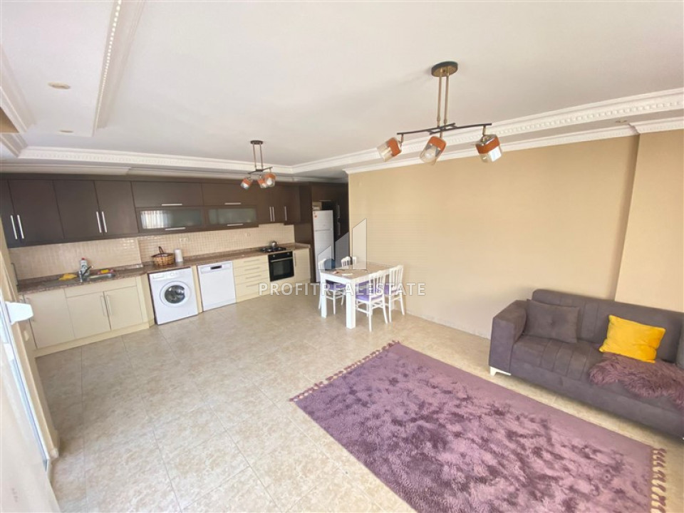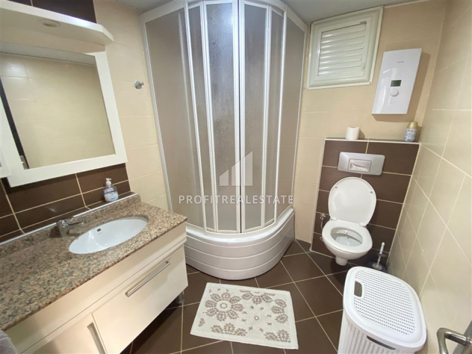 The apartment, layout 2 + 1, with a total area of 110m² has a spacious living room combined with a kitchen area. In the recreation area - high-quality upholstered furniture, TV on the cabinet, air conditioning. Kitchen - with a full set of appliances, plenty of storage space for kitchen utensils, granite countertops with a spacious work area. The bedrooms are furnished with all necessary furniture. There is a spacious wardrobe for outerwear and shoes in the large hallway. The spacious bathroom is fully equipped with high-quality furniture and sanitary ware, a flowing water heater is installed. The large northern balcony, which has a cozy dining area, offers a view of the mysterious and inviting Taurus Mountains, with snowy peaks in winter. From the western balcony, a side view of the endless expanse of the Mediterranean Sea, turning into the horizon, opens up.