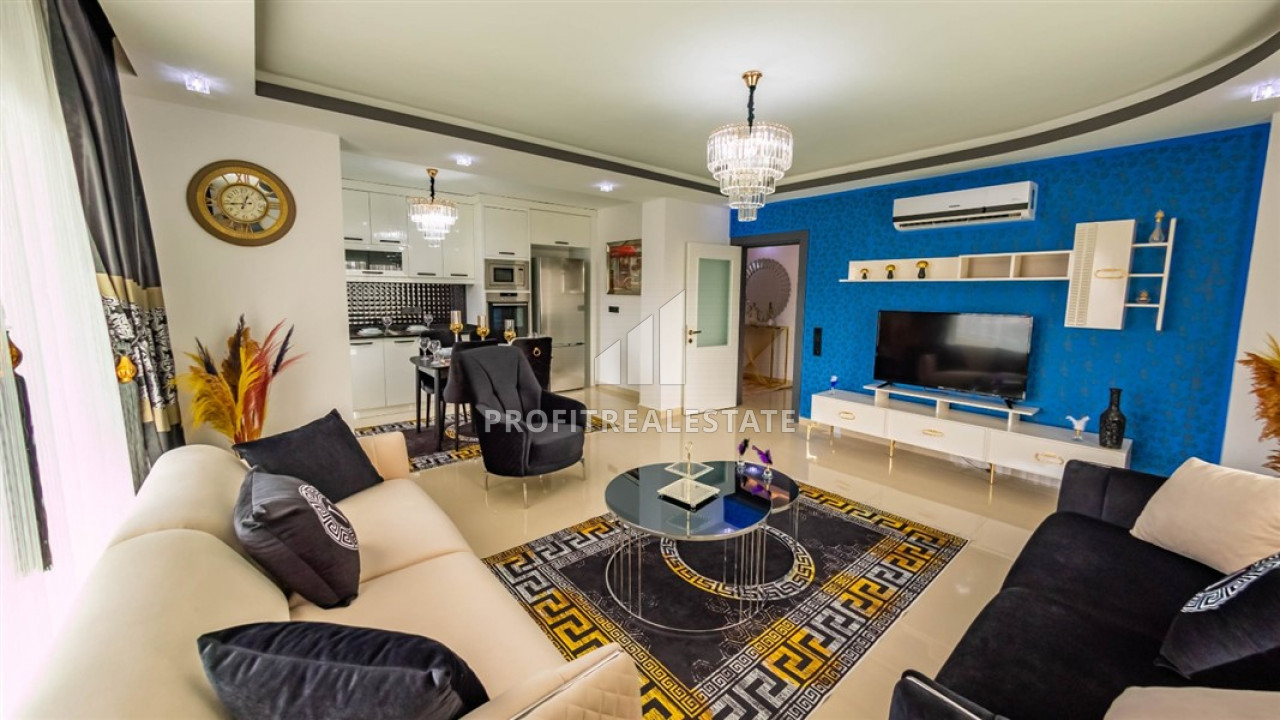 The apartment has 2 + 1 layouts and a total area of 125m² has a spacious living room, combined with a kitchen, somewhat separated from the relax area, which has high-quality upholstered furniture, a large TV on the TV table. Lovely dining area for 4 persons. Kitchen area - with plenty of storage space for utensils, granite countertop with a spacious work area and a complete set of household appliances. The bedrooms are furnished with all necessary furniture. There is a fine entrance hall. A spacious bathroom and a guest bathroom are fully equipped with quality furniture and fixtures. Two large balconies, which, if desired, can be glazed, will allow you to admire the sea, mountains, unique sunsets and the Alanya fortress, which is beautifully illuminated in the evening.