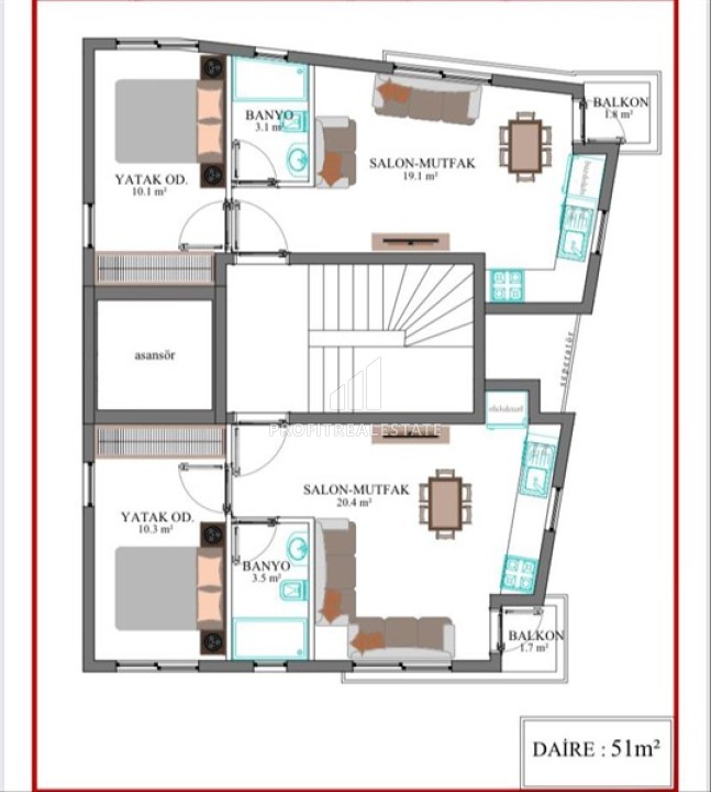 The residence consists of only 30 apartment. The construction company offers apartment of the following layouts: one bedroom apartment, 1+1 layouts, with an area of 50 m², and two bedroom apartment, 2+1 layouts, with an area of 70 m².