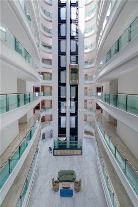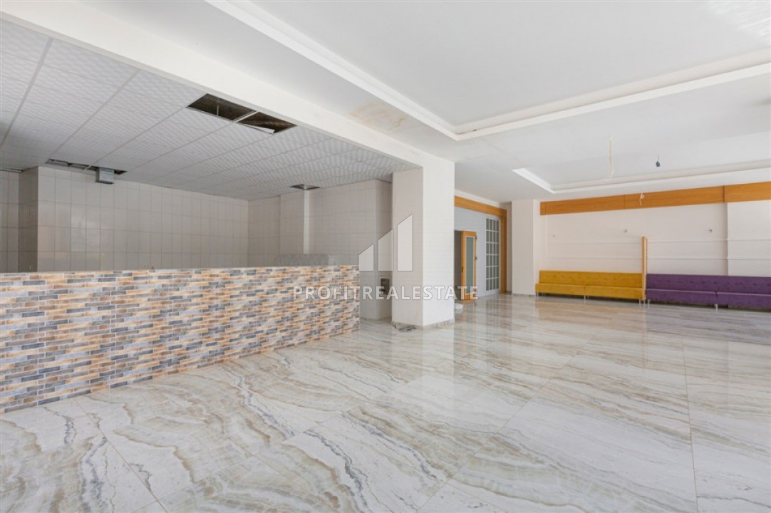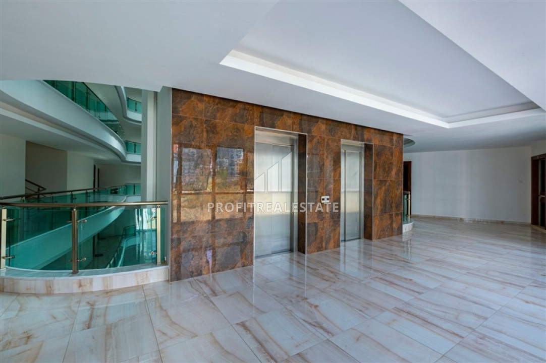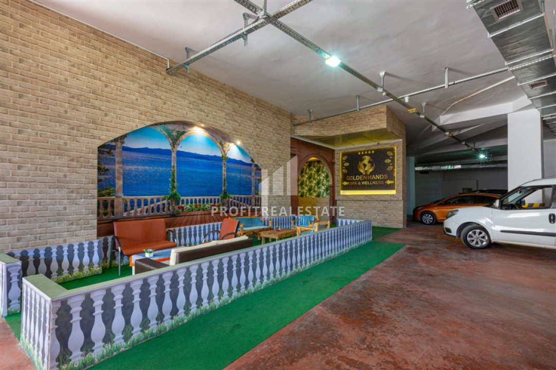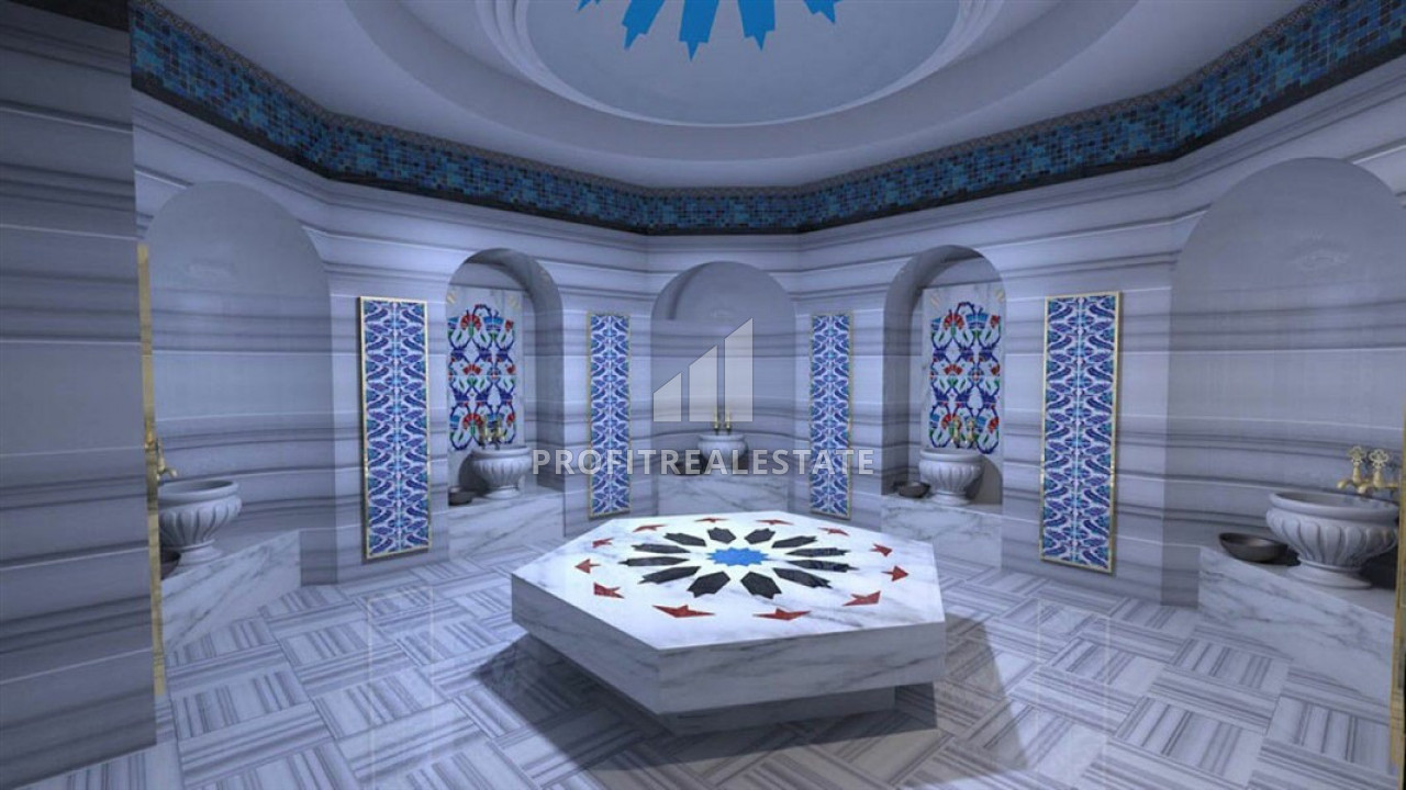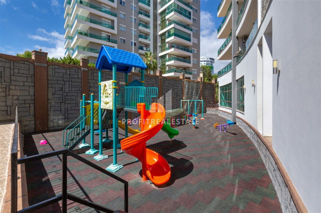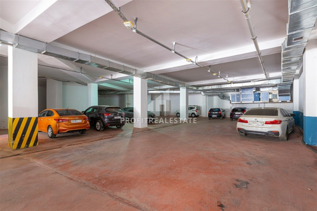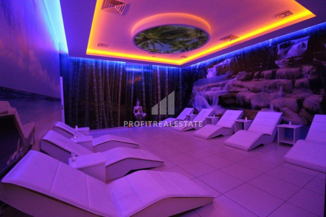 The windows of the apartment face the east side, and it itself located on the 3rd floor of a residential building, built in 2018 and which is part of a residential residence with a large number of services. Its very well maintained territory has a landscaped garden, a large swimming pool with a bar, a children's playground and a pergola for relax. Also, the internal facilities includes an indoor heated pool, a sauna, a hammam, a gym, a billiards room, a mini-cinema, a central television, and an uninterruptible power supply generator. The caretaker keeps order in the residence. the cost of the monthly service is 200 liras. As for the location - the distance to the sea is 700 meters, to the center of the district - 200 meters.