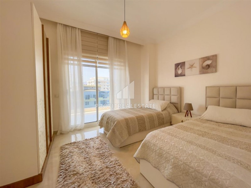 It is in such a residence, commissioned in 2020, with extensive facilities that a 2 + 1 apartment with an area of 125m² on the 7th floor is offered for sale. Apartment 2 + 1 provides a spacious living room combined with an open kitchen area, two bedrooms, two bathrooms, an entrance hall and two balconies. The spacious corner kitchen area is equipped with the necessary furniture with plenty of storage space for kitchen utensils and complete sets of household appliances. The spacious living room with panoramic windows and beautiful soft furnishings is somewhat separated from the dining area for 4 people and the kitchen area. The large entrance hall has a spacious wardrobe. Two bathrooms are fully equipped with quality furniture and bathroom equipment. There are two spacious balconies with outdoor furniture, which offer stunning views of the Taurus Mountains. The apartment is oriented to the north and west. The apartment are sold fully equipped: with furniture, household appliances, textiles and interior items.