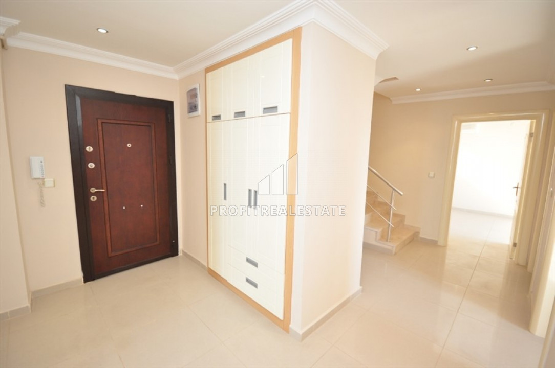 The layout of the apartment provides for a spacious living room with upholstered furniture, combined with a spacious open kitchen of the original location, a dining area somewhat separated from the recreation area, three large bright bedrooms, 3 spacious bathrooms with all necessary furniture and appliances. On the lower floor of the duplex there is a spacious entrance hall with a spacious built-in wardrobe, a comfortable wide staircase leads to the upper floor. On the lower floor of the apartment there are two spacious corner balconies, and on the upper floor there is a huge terrace encircling the entire apartment with a charming view of the Mediterranean Sea, the Alanya fortress and the Taurus Mountains. The apartment is oriented to the east, south and west, which, along with stunning views, will ensure good ventilation of the apartment during the hot period. The apartment have underfloor heating. The apartment is sold with furniture and appliances shown in the photo. Buying decorative elements, home textiles and giving this magnificent duplex coziness and charm will fall to the lot of future owners. Comprehensive assistance in this matter, if necessary, will be provided by our after-sales service staff.